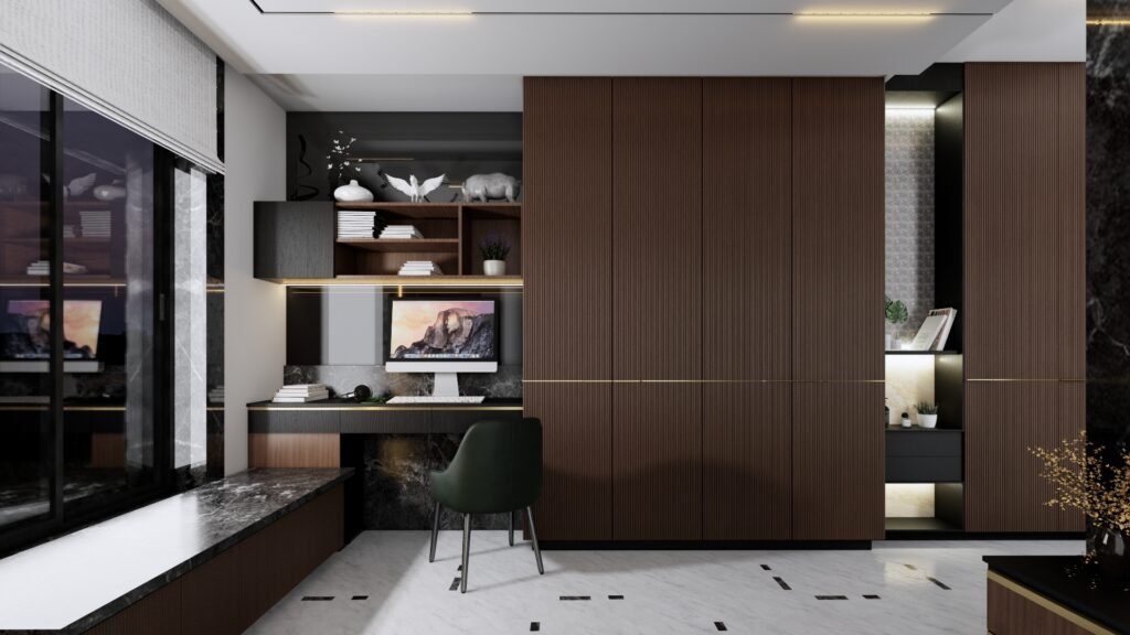 Neutral colours were retained throughout the building – Italian marble floors, beige coloured walls and use of complementary teak wood texture on doors and windows. The addition of 2 large inward looking courtyard spaces was done to provide natural light and privacy