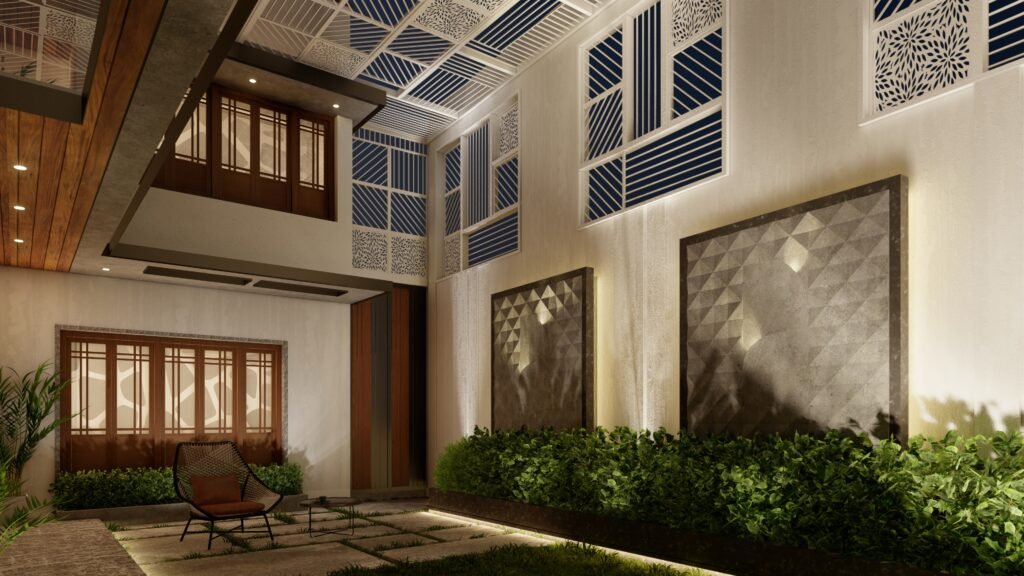 Doors and panels with perforations are made to let in some natural light and to create a calming, celestial ambiance through their design. The prayer room then opens up to a sit-out space beneath a metal roof that provides direct access to the skies. The area is zoned so that it is separate from other areas of the house and has its own significance.